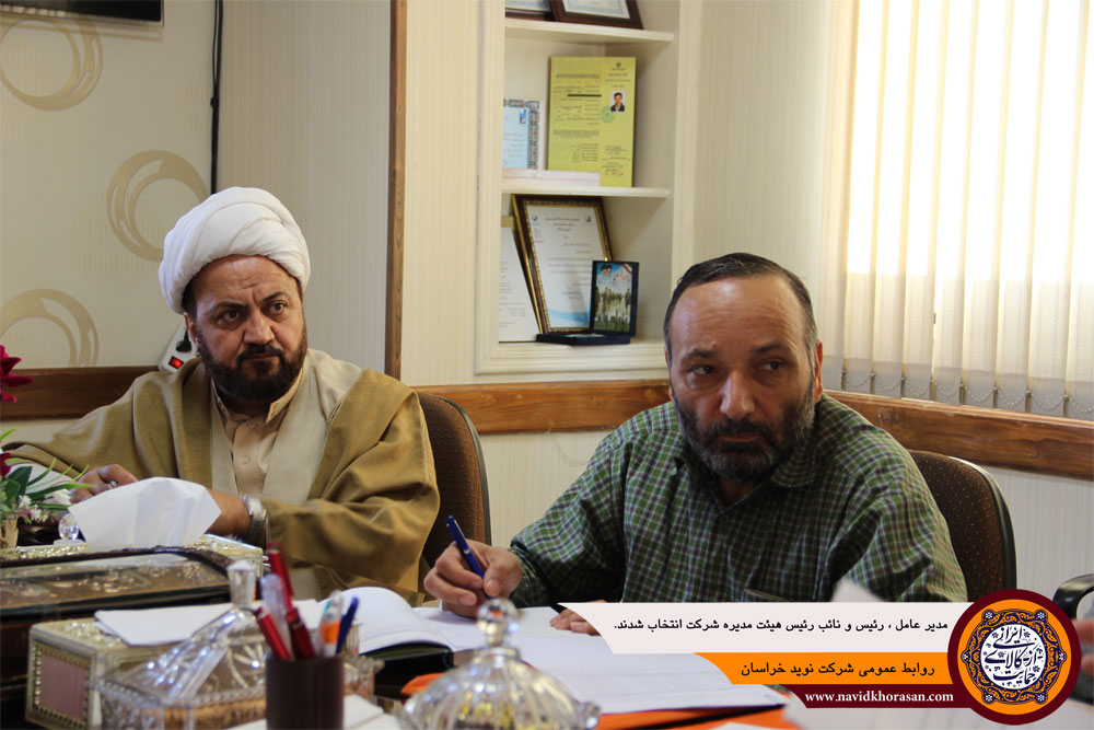 به گزارش روابط عمومی شرکت نوید خراسان در پی برگزاری انتخابات در مجمع عمومی فوق العاده صاحبان سهام شرکت نوید خراسان (مورخه 28 تیرماه سال جاری ) و انتخاب حجه السلام مسعود دری و آقای احمد بیرق شمشیر بعنوان اعضاء جدید هیئت مدیره شرکت ، روز گذشته 28 مردادماه سال جاری جلسه هیئت مدیره با محوریت بررسی مسائل جاری شرکت و تعیین مدیر عامل و تقسیم وظائف و مسئوولیت هریک از اعضاء هیئت مدیره در اطاق جلسات شرکت برگزار شد ، و با رای گیری که بعمل آمد آقای غلامرضا اصغر زاده گلزار را بعنوان رئیس هیئت مدیره در سمت خود ابقاء نمودند و جناب حجه السلام مسعود دری بعنوان نائب رئیس هیئت مدیره انتخاب شد و همچنیین در این جلسه آقای مهندس حسینی سرچشمه بعنوان مدیر عامل شرکت نوید خراسان در سمت خود ابقاء گردید.