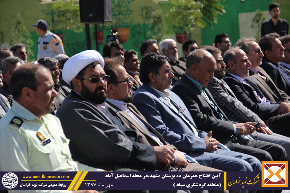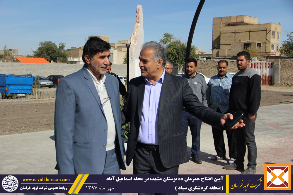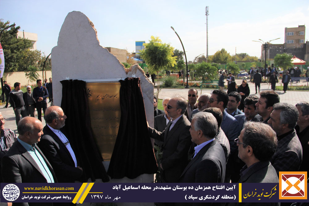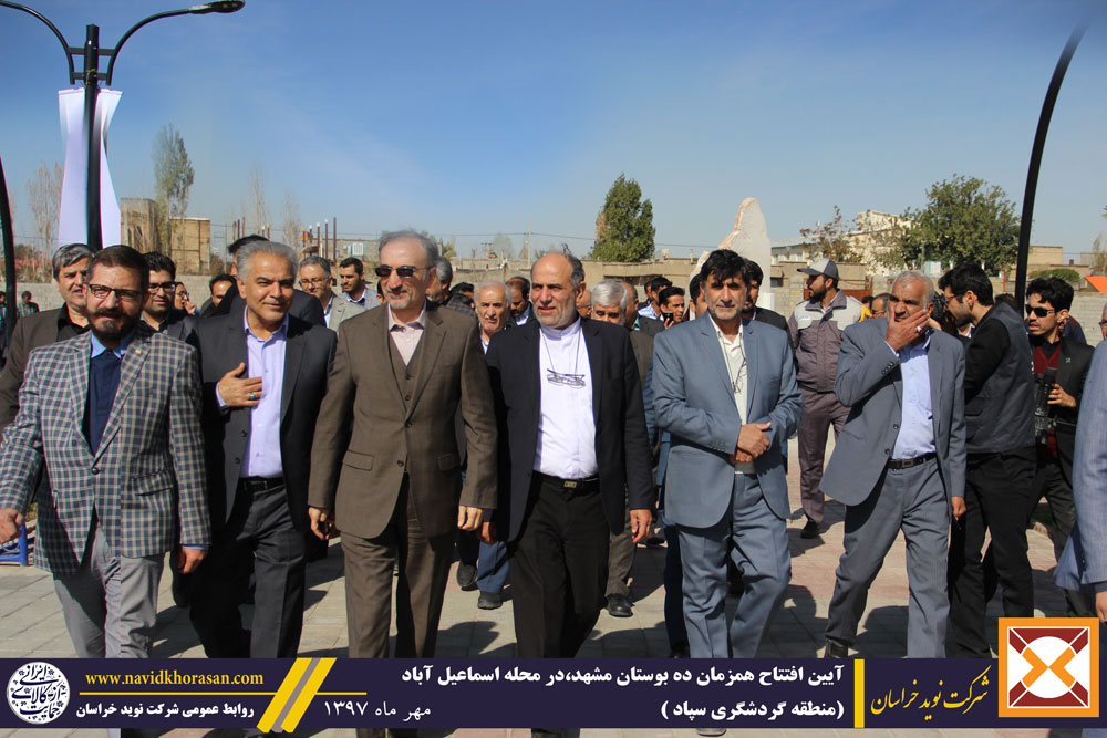 صبح امروز آیین افتتاح همزمان ده بوستان مشهد،با حضور آقای مهندس تقی زاده خامسی شهردار مشهد و تنی چند از اعضاء محترم شورای اسلامی مشهدمقدس و جمعی از مسئولین و مدیران شهری و نیزمدیرعامل شرکت نوید خراسان در پارک تازه تاسیس محله اسماعیل آباد واقع در منطقه گردشگری سپاد برگزار گردید.