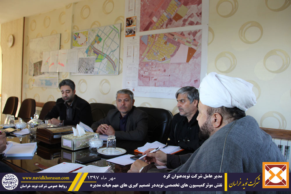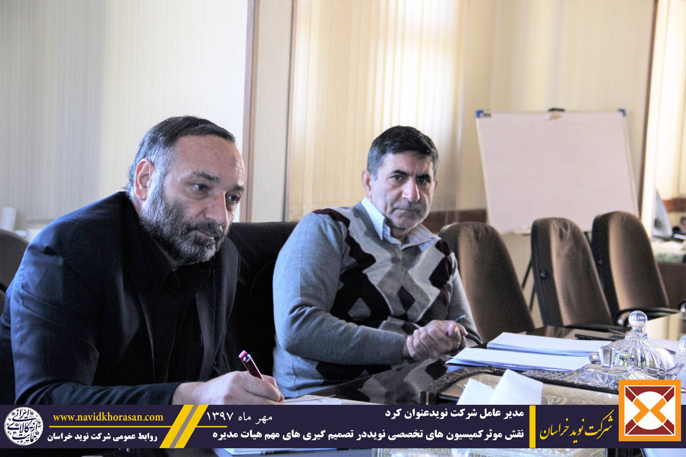 در ابتدای این جلسه پس از تلاوت آیاتی از کلام الله مجید و استماع احادیثی از ائمه اطهار علیهم السلام که توسط حجه السلام دری بیان گردید مدیرعامل شرکت نوید خراسان بر نقش موثر کمیسیون های تخصصی شرکت نوید خراسان در اخذ تصمیم گیری های حساس و مهم هیئت مدیره تاکید کرد وی در بخش دیگری از سخنان خود با اشاره به مصوبه مجمع عادی سالیانه صاحبان سهام نوید مبنی بر واگذاری اراضی 44 هکتاری نوید به سهامداران ،طرح گروه بندی سهامداران که در راستای تحقق مصوبه مجمع تهیه و در جلسات متعدد مورد کارشناسی قرار گرفته است را یاد آوری نمود و بر ضرورت رفع پاره ایی از ابهامات این طرح قبل از ابلاغ و اجراء آن تاکید ورزید مهندس جهانیان اطلاع رسانی صادقانه و به روز با کمترین هزینه را یاد آوری نمود و مدیران شرکت را به پرهیز از اصراف و تبذیر در هزینه های توصیه کرد سپس آقایان حجه السلام دری و بیرق شمشیر از اعضاء هیأت مدیره و عضو کمیسیون سهام و روابط عمومی در این جلسه بر ضرورت بصیرت افزایی ،زمان شناسی،بر گزاری جلسات میدانی ،مشورت با اهل فن در همه امور و سرعت بخشی به روند پرداخت سود به سهامداران تاکید ورزیدند.