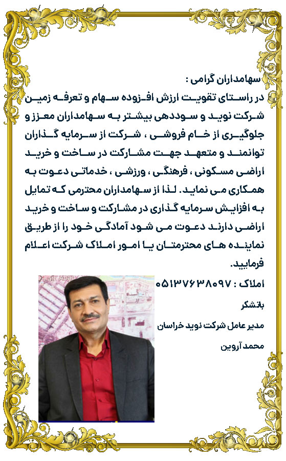 اطلاعیه رسمی به سهامداران محترم شرکت نوید خراسانبا سلام و احترام احتراماً، ضمن تبریک فرارسیدن ماه شعبان و اعیاد شعبانیه