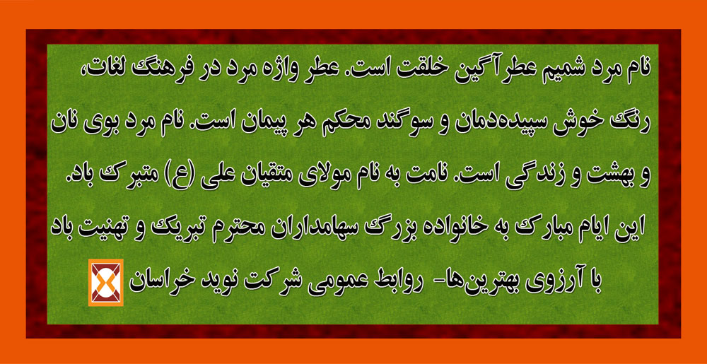 نام مرد شمیم عطرآگین خلقت است. عطر واژه مرد در فرهنگ لغات، رنگ خوش سپیدهدمان و سوگند محکم هر پیمان است. نام مرد بوی نان و بهشت و زندگی است. نامت به نام مولای متقیان علی (ع) متبرک باد. این ایام مبارک به خانواده بزرگ سهامداران محترم تبریک و تهنیت باد